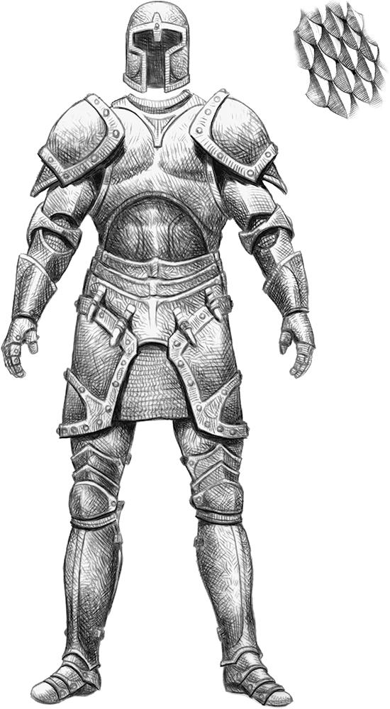 Plate consists of shaped, interlocking metal plates to cover the entire body. A suit of plate includes gauntlets, heavy leather boots, a visored helmet, and thick layers of padding underneath the armor. Buckles and straps distribute the weight over the body.