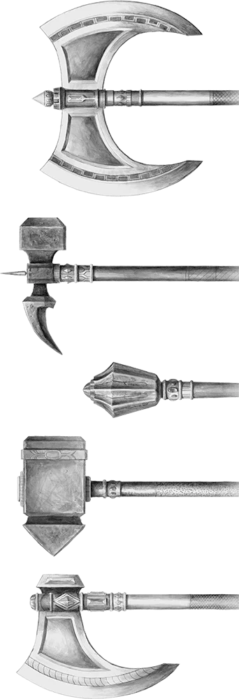 Your race, class, and feats can grant you proficiency with certain weapons or categories of weapons. The two categories are simple and martial. Most people can use simple weapons with proficiency. These weapons include clubs, maces, and other weapons often found in the hands of commoners. Martial weapons, including swords, axes, and polearms, require more specialized training to use effectively. Most warriors use martial weapons because these weapons put their fighting style and training to best use.
