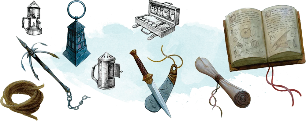 Burglar’s Pack (16 gp). Includes a backpack, a bag of 1,000 ball bearings, 10 feet of string, a bell, 5 candles, a crowbar, a hammer, 10 pitons, a hooded lantern, 2 flasks of oil, 5 days of rations, a tinderbox, and a waterskin. The pack also has 50 feet of hempen rope strapped to the side of it.