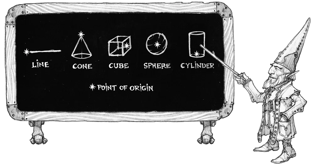 Spells such as burning hands and cone of cold cover an area, allowing them to affect multiple creatures at once. A spell’s description specifies its area of effect, which typically has one of five different shapes: cone, cube, cylinder, line, or sphere. Every area of effect has a point of origin, a location from which the spell’s energy erupts. The rules for each shape specify how you position its point of origin. Typically, a point of origin is a point in space, but some spells have an area whose origin is a creature or an object.